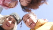 4 young smiling women in a group - heads together shot from below - outside on a bright sunny day