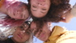4 jonge glimlachende vrouwen in een groep-hoofden samen schot van onder - HD Stockvideo